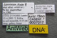 Apomyrmastygia este o specie de furnică găsită în Africade Vest, descrisă pentru prima dată în 1970. Este singura specie din genul monotipicApomyrma, tribul Apomyrmini, și subfamilia Apomyrminae. S-a sugerat că furnicile trăiesc în principal în pădurile tropicale și se pare că aparțin unei bresle de furnici cu care se hrănesc centipedele.
